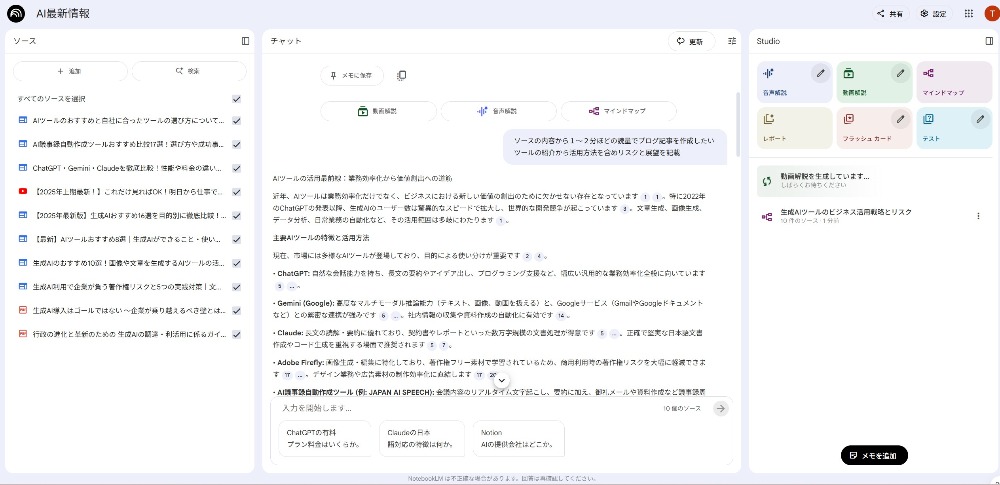 今回はGoogle NotebookLMというツールを使って画像のように作成しています。