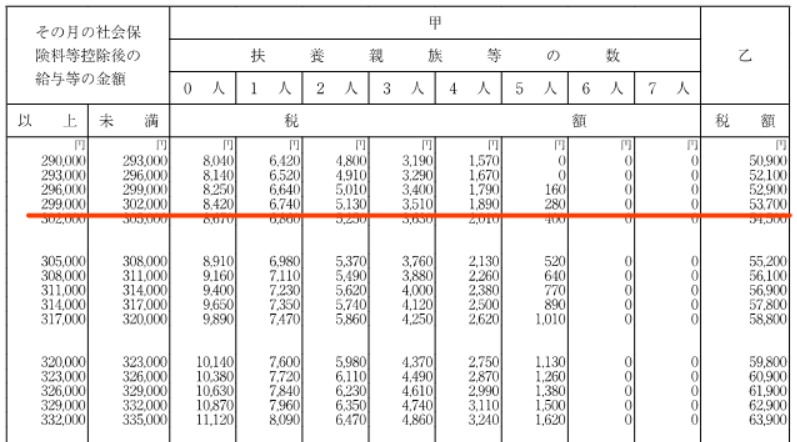 例えば、社会保険料控除後の給与が30万円、扶養親族が0人の方の源泉所得税は8,420円になります。