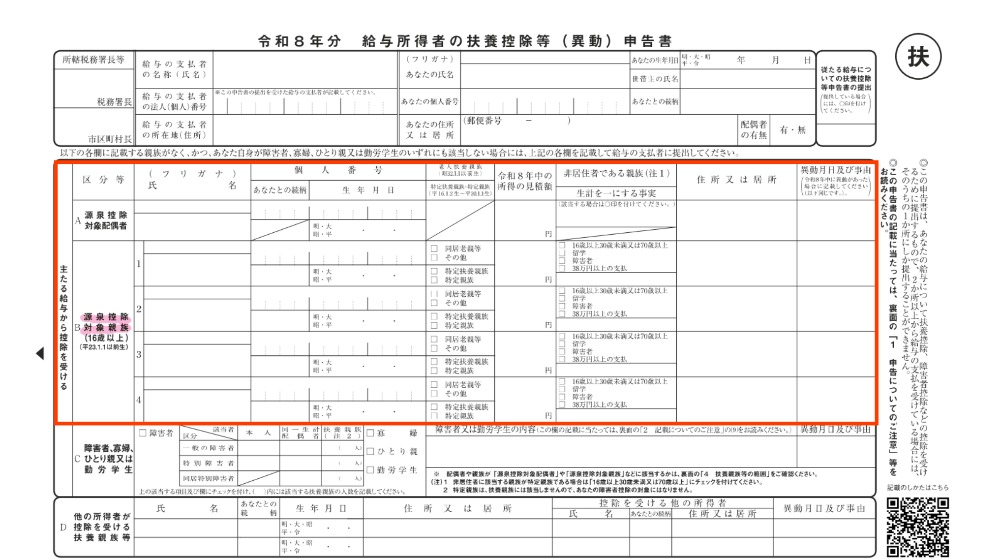 令和8年以降は、配偶者については令和7年以前と変更ありませんが、扶養親族については「控除対象扶養親族」から「源泉控除対象親族」に改正されています。