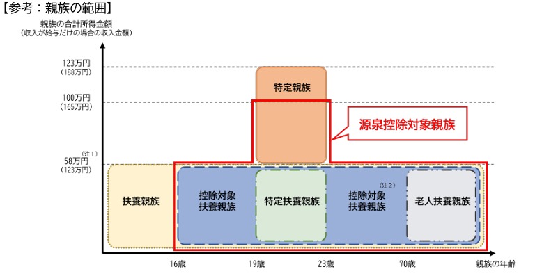 源泉控除対象親族とは、控除対象扶養親族に加えて、19歳以上23歳未満の特定親族のうち所得100万円(給与所得165万円)以下の人も追加された扶養親族のことです。